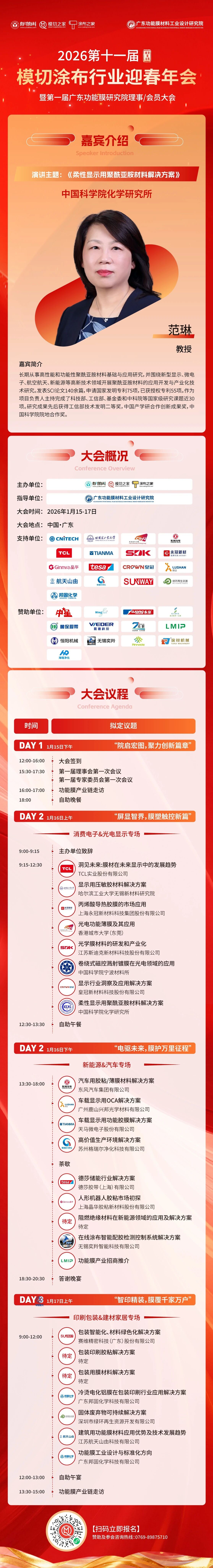 为促进产业交流及供需对接,由广东功能膜材料工业设计研究院指导、有材有料&模切之家&涂布之家主办的2026第十一届“国材当自强”模切涂布行业迎春年会暨第一届广东功能膜研究院理事/会员大会将于1月15-17日在广东召开,本次会议将聚焦AI+光电显示、新能源+新能源汽车、家居包装等多个纬度展开探讨,大会有幸邀请到中国科学院化学研究所/范琳教授出席分享《柔性显示用聚酰亚胺材料解决方案》,诚邀广大业界朋友拨冗出席,共话行业发展!