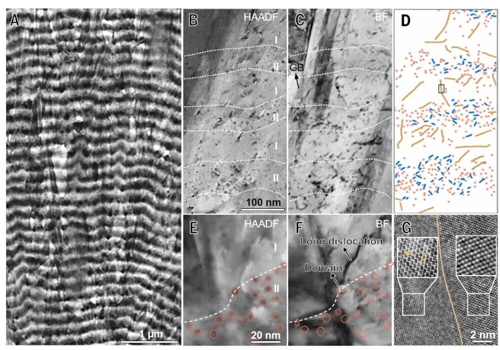 图3:展示变形后微观结构,揭示不同层中位错分布差异及其与超纳米畴的相互作用。