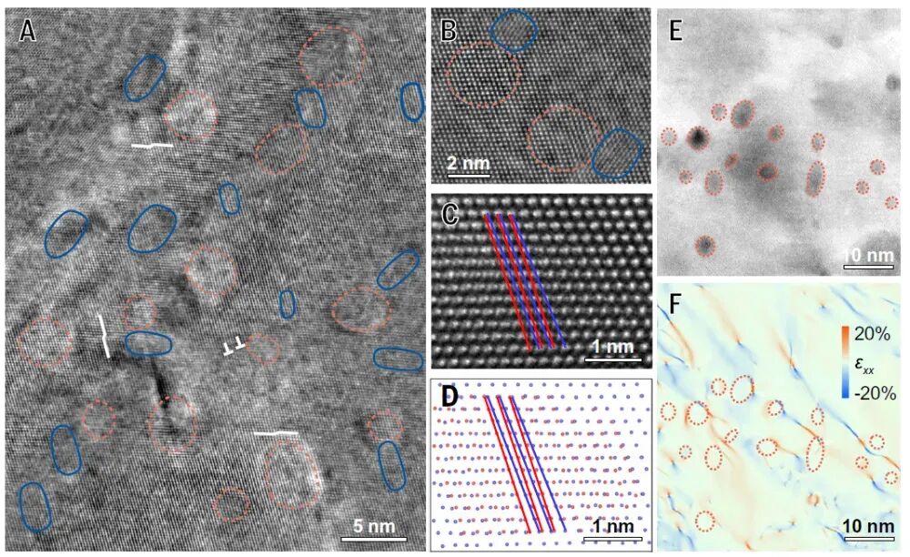图4:原子尺度分析位错行为,揭示螺型位错及应变分布机制,解释强度与韧性协同来源。